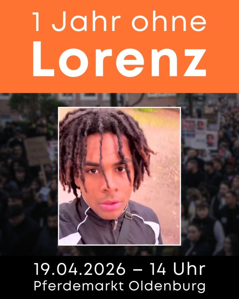 Mittlerweile ist es fast ein Jahr her, dass Lorenz in der Nacht zu Ostersonntag am 20.04.2025 mitten in der Oldenburger Innenstadt von der Polizei erschossen wurde. Vier Schüsse trafen Lorenz, drei davon von hinten. Lorenz verstarb an den Schüssen im Alter von 21 Jahren. Lorenz war ein Sohn, ein Bruder, ein Freund, ein Kind der Stadt Oldenburg, ein Teil unserer Community. Viele Menschen kannten, mochten und liebten Lorenz und vermissen ihn bitterlich.